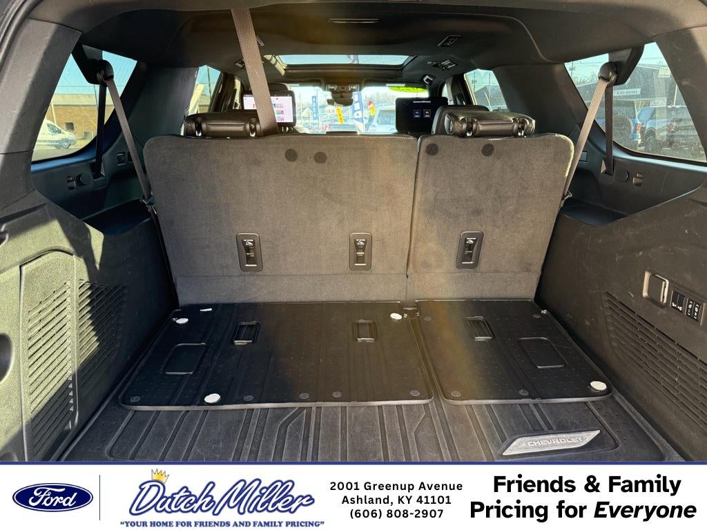 Max Trailering Package. Advanced Trailering Package: Trailer Side Blind Zone Alert; Smart Trailer Integration Indicator; Integrated Trailer Brake Controller; Hitch Guidance with Hitch View. Advanced Technology Package: Super Cruise; Reverse Automatic Braking. Preferred Equipment Group 3LZ: Bright Front and Rear Door Sill Plates; Memory Settings; Perforated Leather Seating Surfaces; Remote Start; 3rd Row 60/40 Power-Folding Split-Bench; Safety Alert Seat; Chrome Door Handles with Body-Color Strip; Hill Descent Control; 6.2L EcoTec3 V8 Engine; Rear Camera Mirror Washer; Inside Rearview Auo-Dimming Rear Camera Mirror; Heated Steering Wheel; LED Daytime Running Lamps; Rear Cross Traffic Alert; Wheels: 22" X 9" Sterling Silver Premium Painted; Driver and Front Outboard Passenger Airbags; Heated Driver and Front Passenger Seats; Wireless Charging; Front Bucket Seats; Universal Home Remote; Color-Keyed Carpeting Floor Covering; Heated 2nd Row Outboard Seats; Hands-Free Rear Power Programmable Liftgate; Chevrolet Infotainment 3 Premium System Radio; 2-Speed Active Electronic Autotrac Transfer Case; 1st and 2nd Row Color-Keyed Carpeted Floor Mats; Enhanced Driver Information Center; Floor Console; Lane Change Alert with Side Blind Zone Alert; Dual Exhaust System; SiriusXM Radio with 360L; HD Surround Vision; Heated and Ventilated Driver and Front Passenger Seats; Wrapped Steering Wheel; Power Tilt and Telescopic Steering Column; 15" Diagonal Multi-Color Head-Up Display; Rear Pedestrian Alert; Bose 10-Speaker Surround with CenterPoint; Magnetic Ride Control Suspension; Infotainment Display; Power Release 2nd Row Bucket Seats; Enhanced Automatic Emergency Braking; 275/50R22SL AS BW Tires; Outside Heated Power-Adjustable Mirrors. Super Cruise. Rear Seat Media System. Dual-Pane Power Panoramic Sunroof. Black Roof Rack Cross Rails. 1st. 2nd and 3rd Row All-Weather Floor Liners (LPO). Front and Rear Black Bowtie Emblems. Reverse Automatic Braking. **Equipment listed is based on original vehicle build and subject to change. Please confirm the accuracy of the included equipment by calling the dealer prior to purchase.**